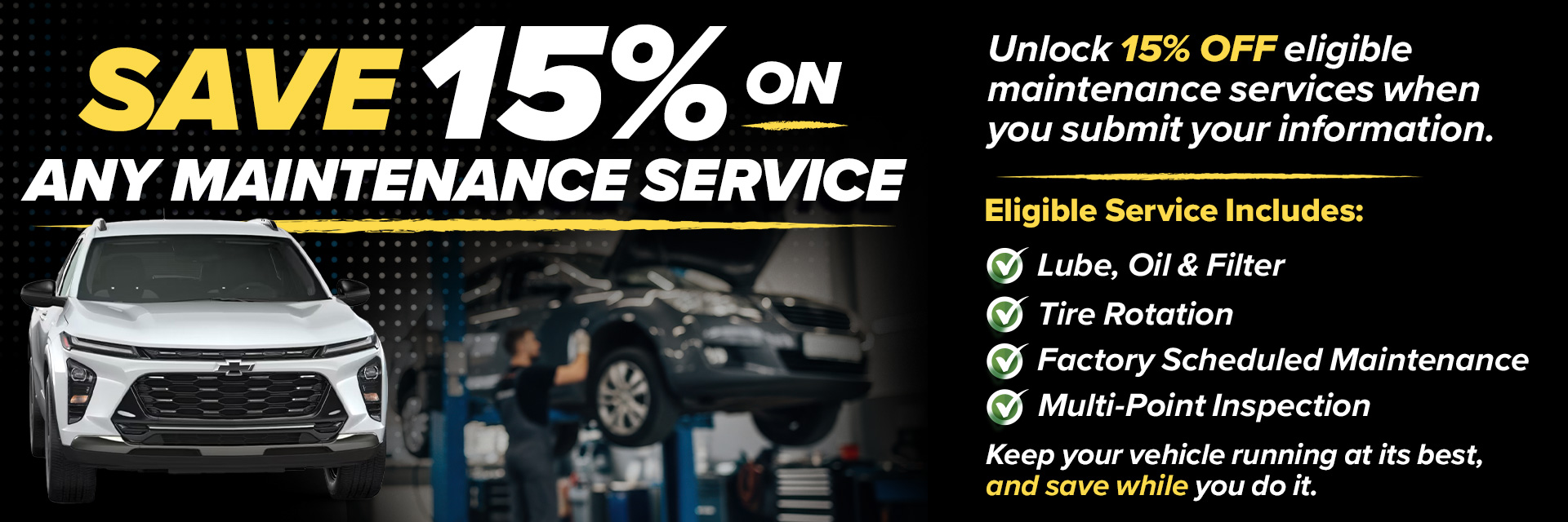 Offer valid for 15% off eligible maintenance services performed at participating Chevrolet dealership. Discount applies to labor and qualifying maintenance services only. Dealer reserves the right to determine maximum discount amount. Not valid with any other offer, discount, or GM program. Excludes tires, parts-only purchases, warranty repairs, recall services, and prior purchases, Must present offer at time of service write-up. No cash value. Dealer reserves the right to modify or cancel this offer at any time. See dealer for complete details and eligibility.